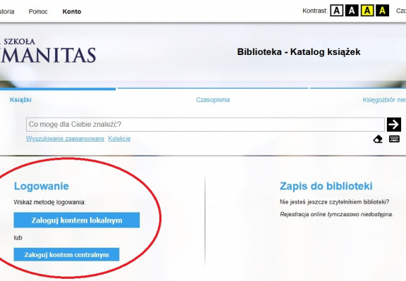 W przypadku problemu z logowaniem przez konto centralne należy użyć opcji „Zaloguj kontem lokalnym”. Czytelnicy logują się przez adres mailowy podany w procesie rekrutacyjnym. Na ten adres mailowy po kliknięciu opcji „Nie pamiętam hasła” zostanie wygenerowane i wysłane hasło do zalogowania w katalogu bibliotecznym. Po pierwszym zalogowaniu system wymusi na użytkowniku zmianę hasła.