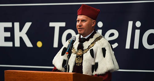 Po przemówieniach przyszedł czas na podsumowanie minionego roku akademickiego przez Rektora dr. Mariusza Lekstona, który wspomniał o najważniejszych wydarzeniach oraz o wyzwaniach jakie czekają Akademię Humanitas w nadchodzących latach.