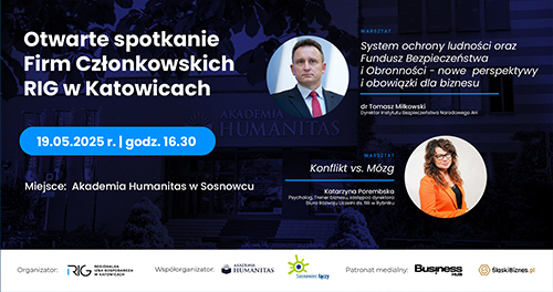 Regionalna Izba Gospodarcza w Katowicach oraz Akademia Humanitas zapraszają na Otwarte Spotkanie Firm Członkowskich RIG, które odbędzie się 19 maja w auli Akademii Humanitas w Sosnowcu, w godzinach 16:30-20:00. To wydarzenie stworzy przestrzeń do rozmów o kondycji polskiego biznesu, wspólnego poszukiwania rozwiązań w obliczu zmieniających się realiów gospodarczych oraz budowania trwałych relacji w gronie aktywnych przedsiębiorców i liderów biznesu.