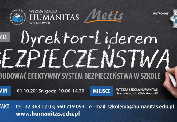 Wyższa Szkoła Humanitas oraz Regionalny Ośrodek Metodyczno – Edukacyjny METIS zapraszają do udziału w konferencji objętej patronatem Komendy Wojewódzkiej Policji w Katowicach pn. Dyrektor – liderem bezpieczeństwa. Jak budować efektywny system bezpieczeństwa w szkole. Konferencja odbędzie się dnia 1 października 2015 r. w auli Wyższej Szkoły Humanitas w Sosnowcu, przy ul. Kilińskiego 43.