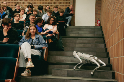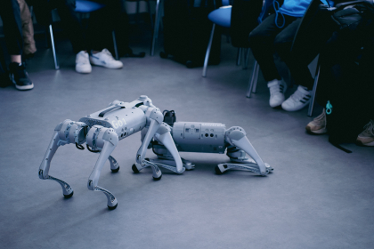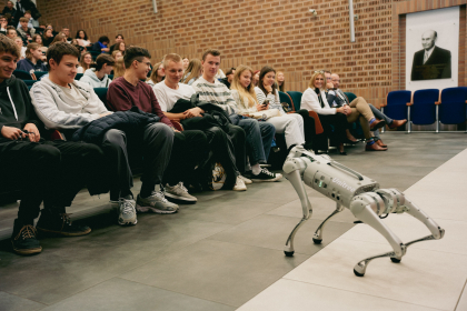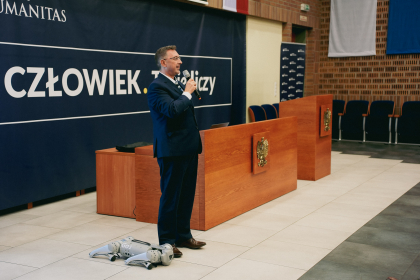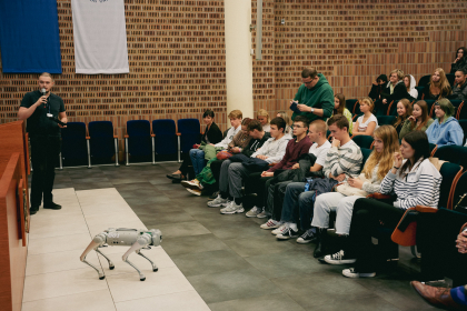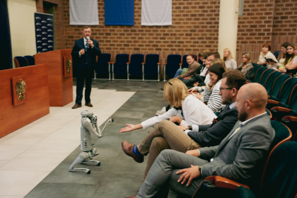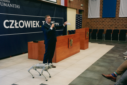 Jednak nie tylko mówcy przyciągnęli uwagę uczestników. Gościem, który zaprezentował swoje możliwości technologiczne był cyber-pies, czyli specjalistyczna platforma krocząca, która będzie wykorzystywana przez studentów Informatyki do nauki programowania platform, przy współpracy ze studentami kierunków nauk społecznych i humanistycznych.